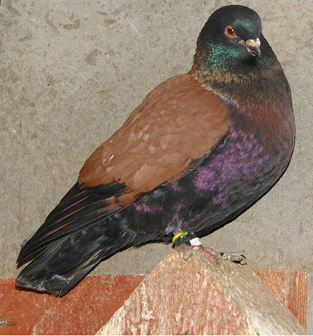 Modenai x pirók hibrid A „fekete” szárnyú pirók galambtól származó extrém teli kovácsoltság és fémfényű, irizáló csillogás kombinálódik a Modenai rövid test alkatával és telt bronz pajzsszínezetével. Ez a galamb nem Spread fekete. Cséplő Á . |