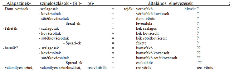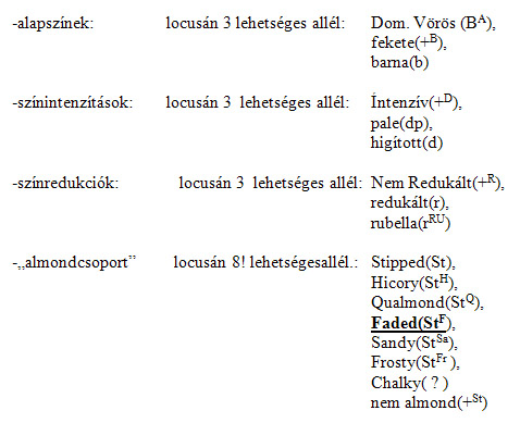A tojók standard színezet elnevezéseit böngészve furcsának hat, hogy a dom. (=hamu) vörösöknél a szalagosak és kovácsoltak „nem” dom. vörösek, hanem „fakók” és úgy tűnhet mintha kizárólag a sötétkovácsolt változat lenne dom. vörös. A kékeknél megjegyzendő, hogy alapjában véve azok is feketék. De mit jelent ez a sok kérdőjel a hímek oszlopában? Azt próbáltam érzékeltetni, hogy a hímek pontos genotípusát kinézetük alapján nem, vagy csak körül belül, kis biztonsággal lehet meghatározni. Előfordulhat, hogy egy fenotípusba osztályozott hímek eltérő genotípusúak, következtetésképpen eltérő módon örökítenek. A dupla Faded texán hím színezete annyira rapszodikusan roncsolódik szét, hogy az alapszínezetre és a színeloszlásra csak bizonytalanul lehet következtetni. A dom. vörös szalagosak: a majdnem fehértől a világosabb koszorúsok, a kovácsoltak: a kissé sötétebb nyakszíneződés körül ingadoznak. A sötétkovácsoltak talán még színesebb nyaki résszel bírnak. A határvonalak, összemosódnak és átfedések lehetnek az egyes változatok között.