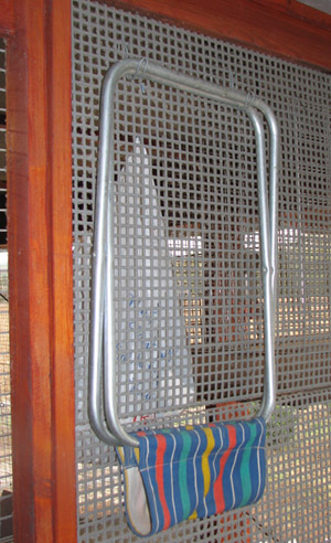9. kép Nem utolsó sorban, a galambdúc fontos kényelmi berendezése ez a falra akasztható ülőke (kempinghokedli), amin saját becses hátsómat szoktam pihentetni. Ne feledjük, a gazda szeme nem csak hizlalja a jószágot, de ha sokszor és sokáig szemlélődünk a galambdúcban , akkor időben észre vehetjük az egészségügyi problémákat, és a tenyésztés sikerét befolyásoló minden egyéb lényeges körülményt.
