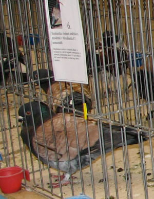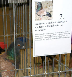 A ketrecfüggvények helyére információs lap került, rajta a kiállított galamb származásával, fontosabb adataival, a megfigyelhető genetikai jelenségekkel. / No standard, no judgement , no points. Instead of them, small cards was hanging up, with the most important informations . |