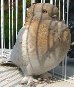 | A teljes testükön színes blondinetták szín meghatározása nem olyan nehéz. A hamis gyöngyszem biztosít bennünket a barna alapszín felől , a bronz árnyalatú nyakrész pedig tudatja hogy intenzív színezettel van dolgunk. | Az előző képhez képest ennél a blondinál marad a rózsás árnyalatú szemszín, de a színezet higított, amiről a szulfur színű mell árulkodik. Ez a galamb tehát dilute, barna, más szóval: khaki színezetű, pikkelyes (sötétkovácsolt) szárnymintázatú. |