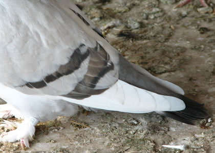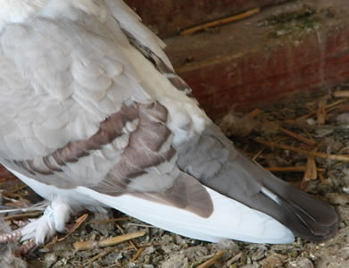 | Íme, a szatinetták fehér szalagja alatt rejtőzködő bronz (vöröses) árnyalat. Biztos, hogy intenzív barna alapszínnel van dolgunk. | Ellenben, ha a fehér szalagok helyén sárgás (szulfur) árnyalatot látunk, akkor az illető galamb nyilván higított kék szalagos. A két közeli kép viszonylag érzékelhetővé teszi a szárnypajzsok kissé különböző árnyalatait. |